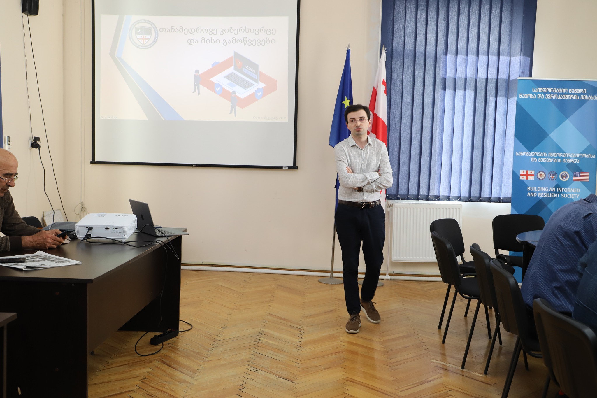 შეხვედრაზე ცენტრის მიერ მოწვეულმა ექსპერტმა, კიბერუსაფრთხოების ბიუროს ინფორმაციული უსაფრთხოების სამმართველოს უფროსმა აკაკი შეყელაძემ კიბერუსაფრთხოების საკითხებზე ისაუბრა.